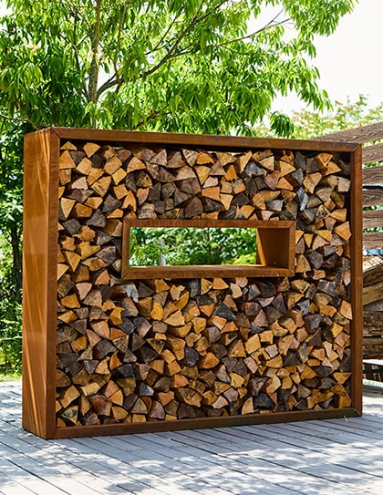デザイン性に優れ、薪をはじめ、お庭の土や緑、コンクリートとの相性が良いコールテン鋼素材です。